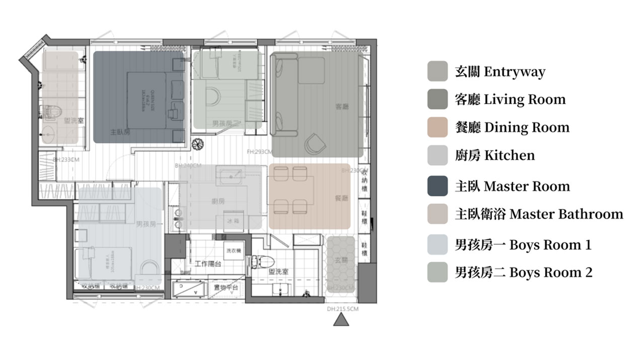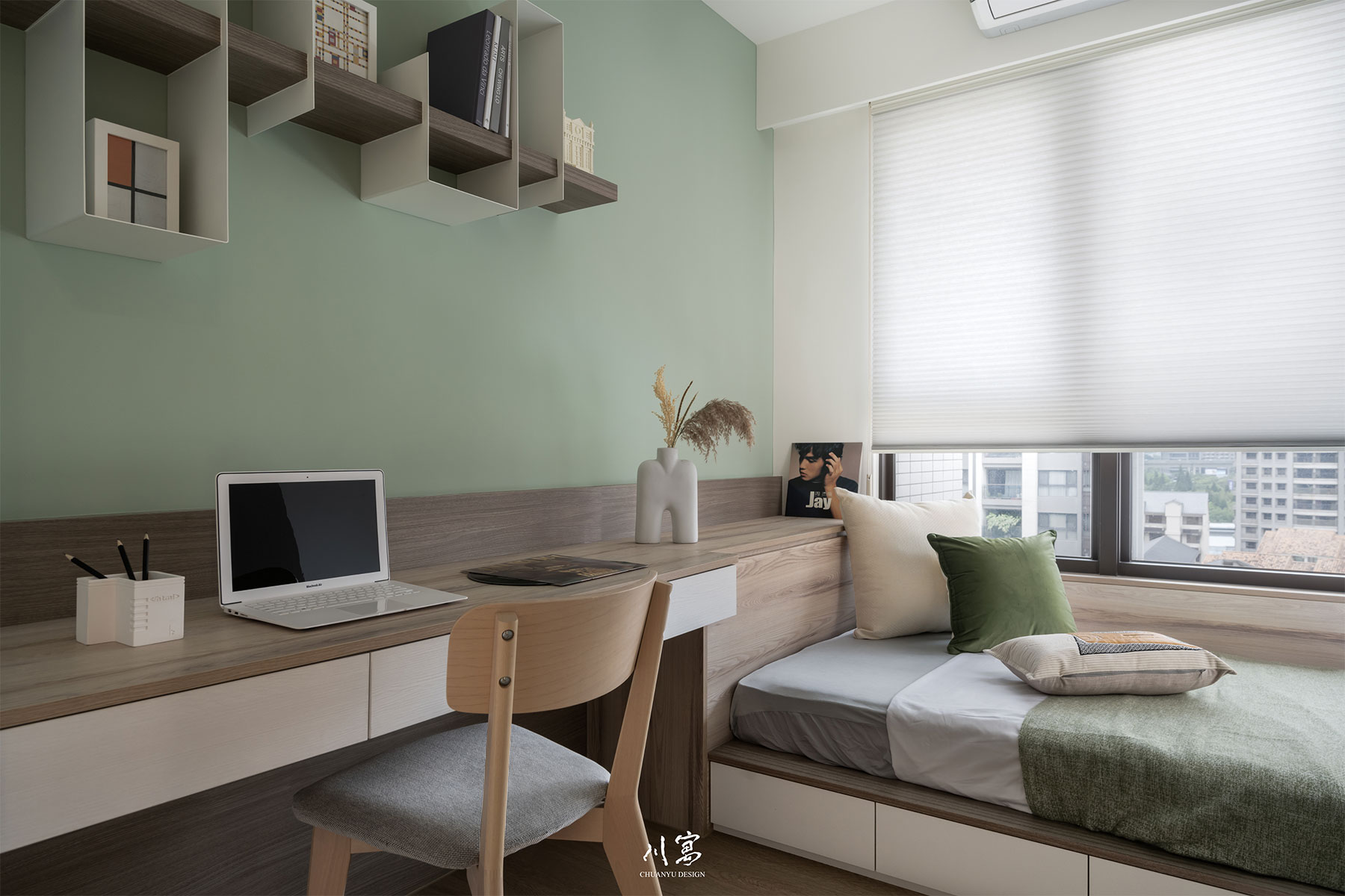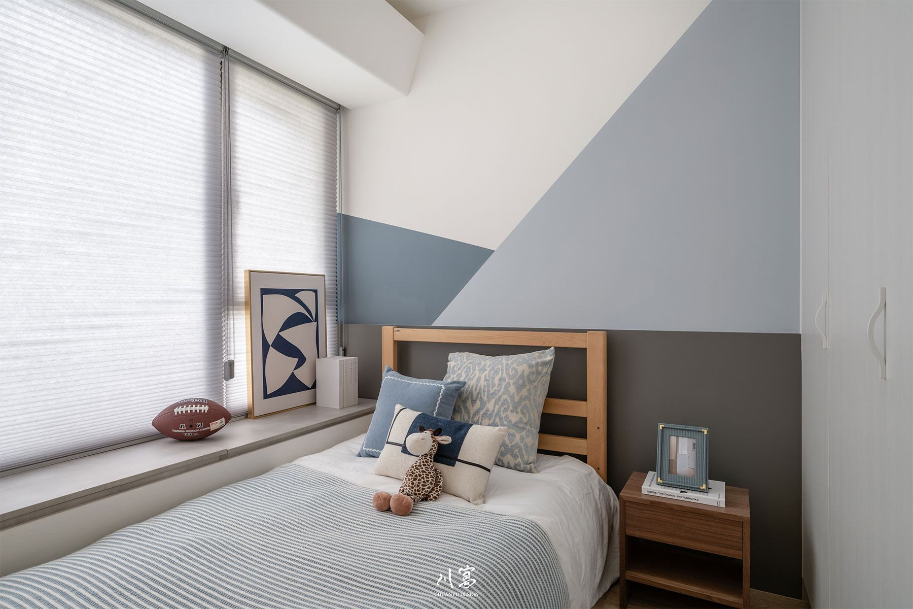 兩個男孩的房間以藍與綠為主色,詮釋不同的個性。綠色房間搭配深暖木色,展現沉穩自然的氣息;藍色房間則結合白色與灰色,營造清爽簡約的氛圍。雖然各自獨立,卻在色彩語彙中與公共空間呼應,維持整體和諧感。