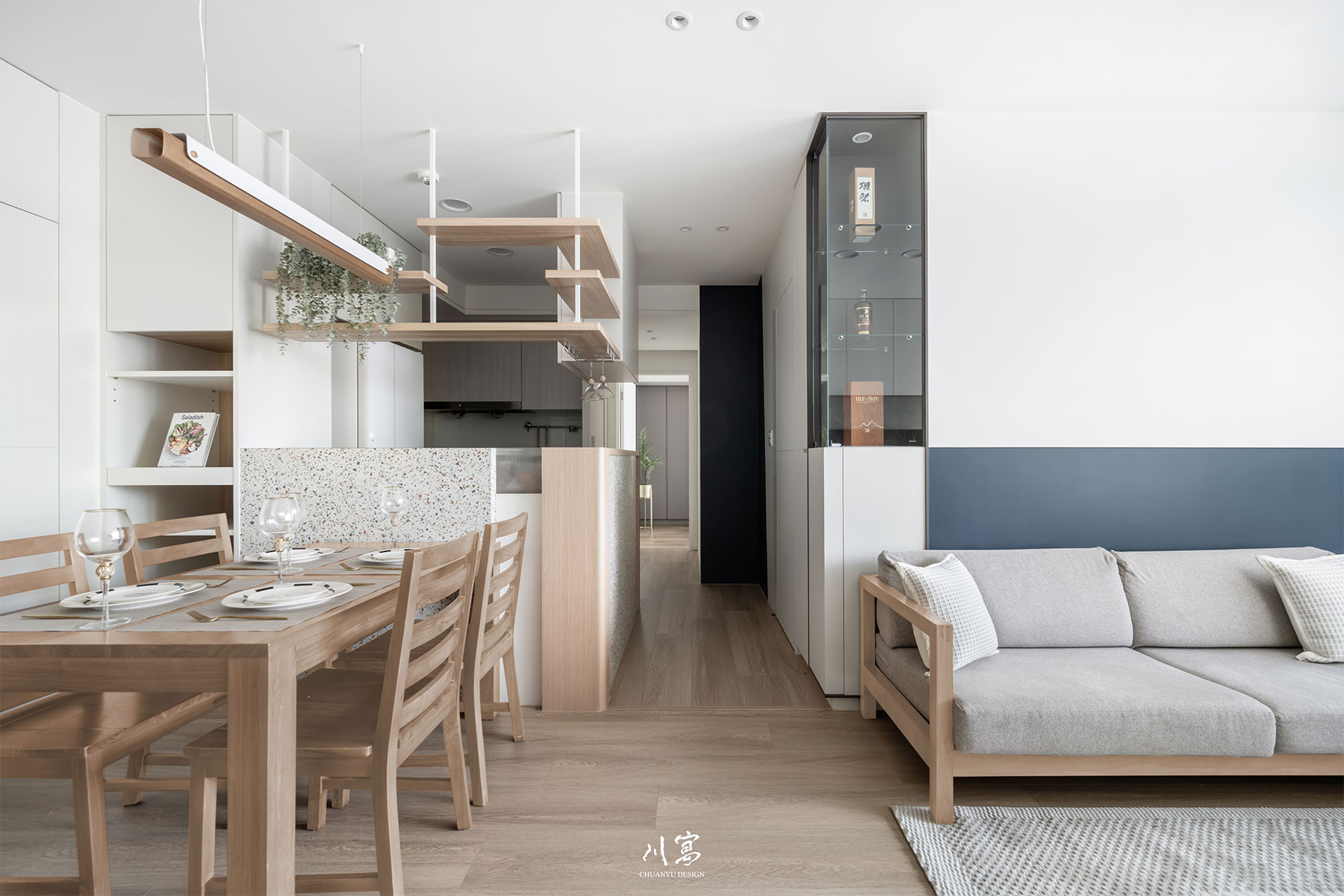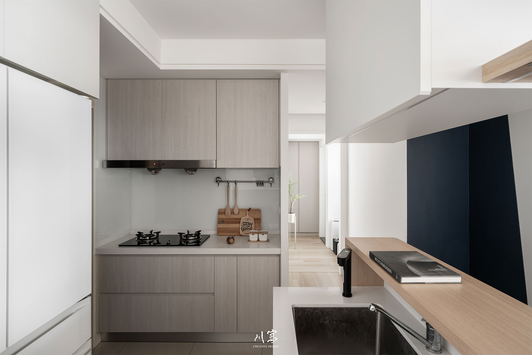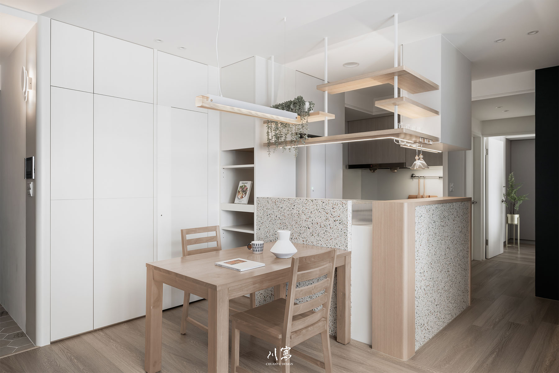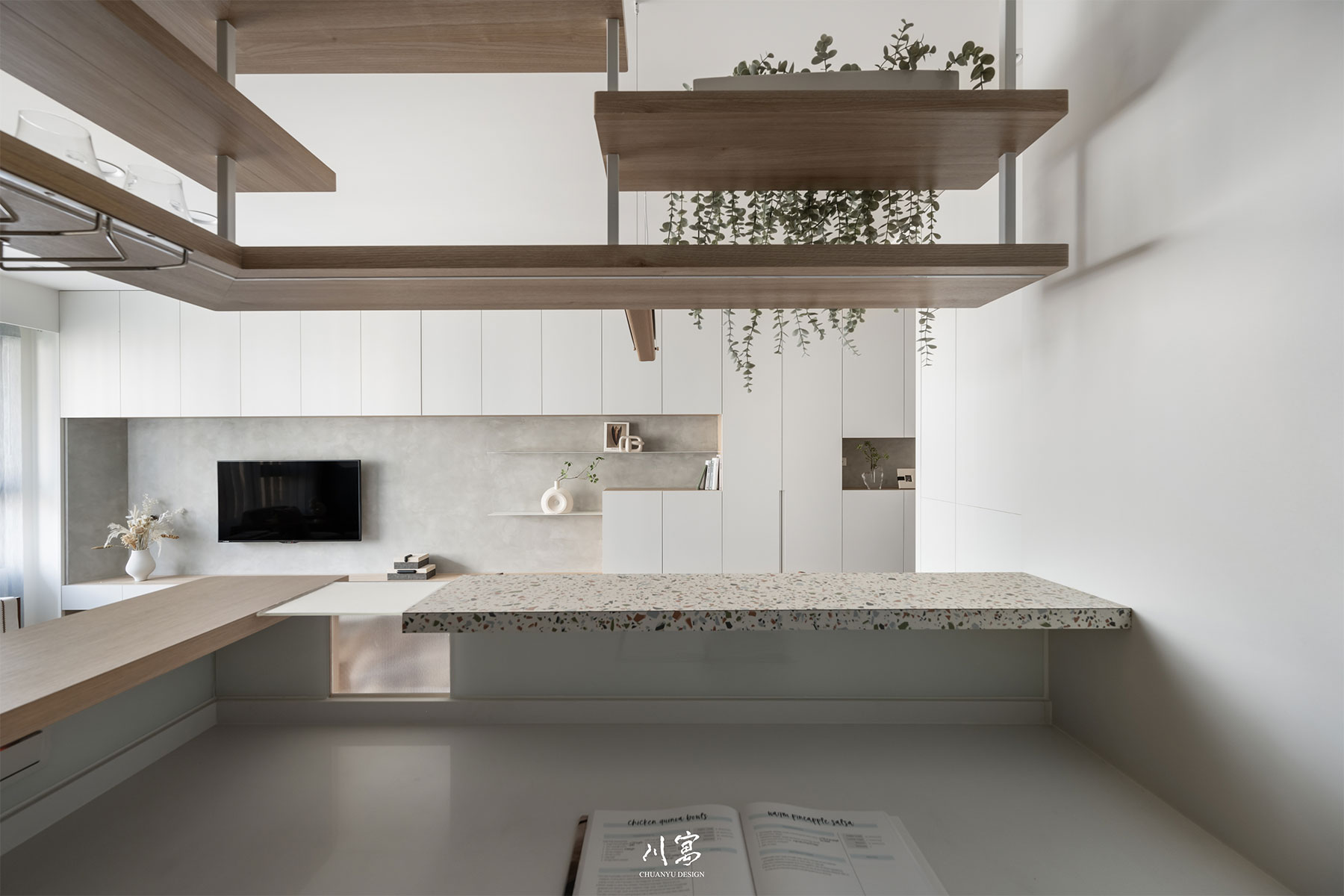 吧台區透過不同材質拼貼打造層次感,為純淨的白色基調注入活潑韻律。木質溫潤與灰色調相互交織,巧妙平衡視覺的單調感。