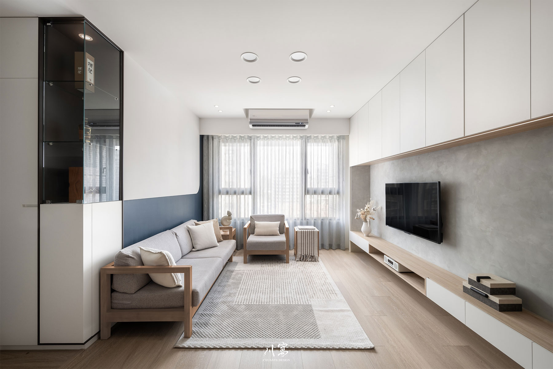 白色櫃體鋪陳純淨基調,搭配淺木色地板,注入自然溫潤的氣息。電視牆以灰色藝術漆延展視覺層次,柔和的紋理隨光影變幻,構築簡約卻不失溫度的客廳場景,展現恬靜而精緻的生活美感。