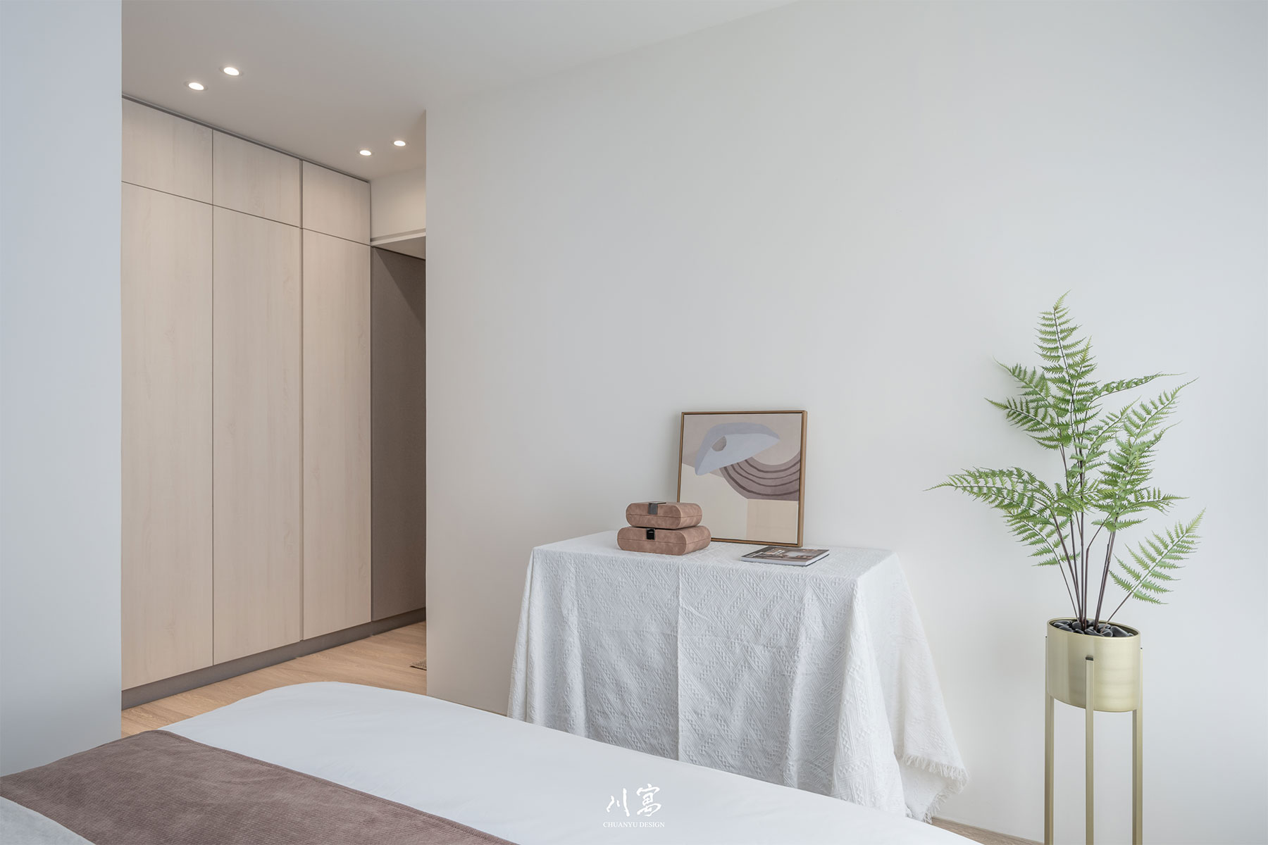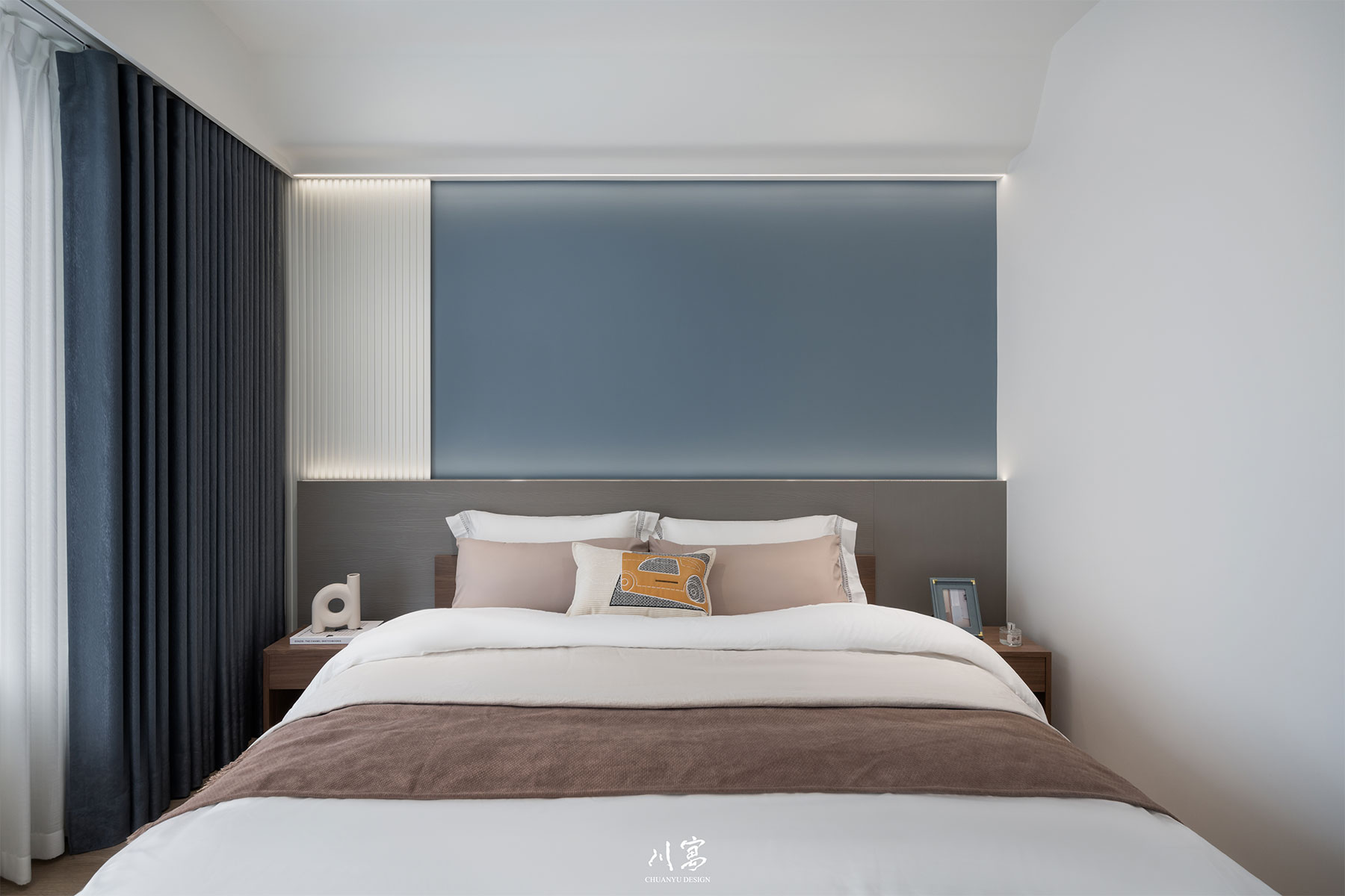 主臥延續客廳的蔚藍色背牆,帶來色彩呼應與整體一致性;純白色牆面作為空間底色,營造明亮與清爽的基調。搭配深灰色木紋床頭板,低調質感與柔和光影交織,讓空間呈現沉穩靜謐的氛圍,休憩時光更放鬆安心。