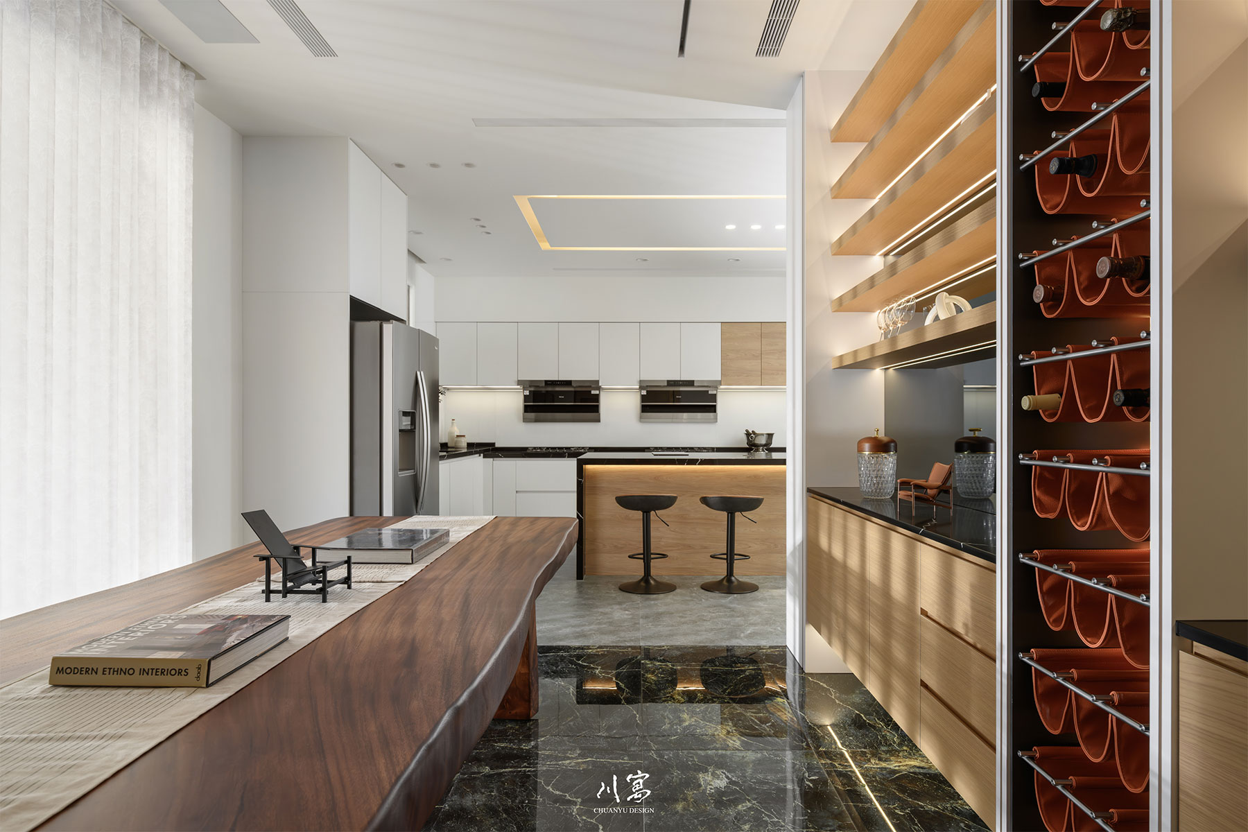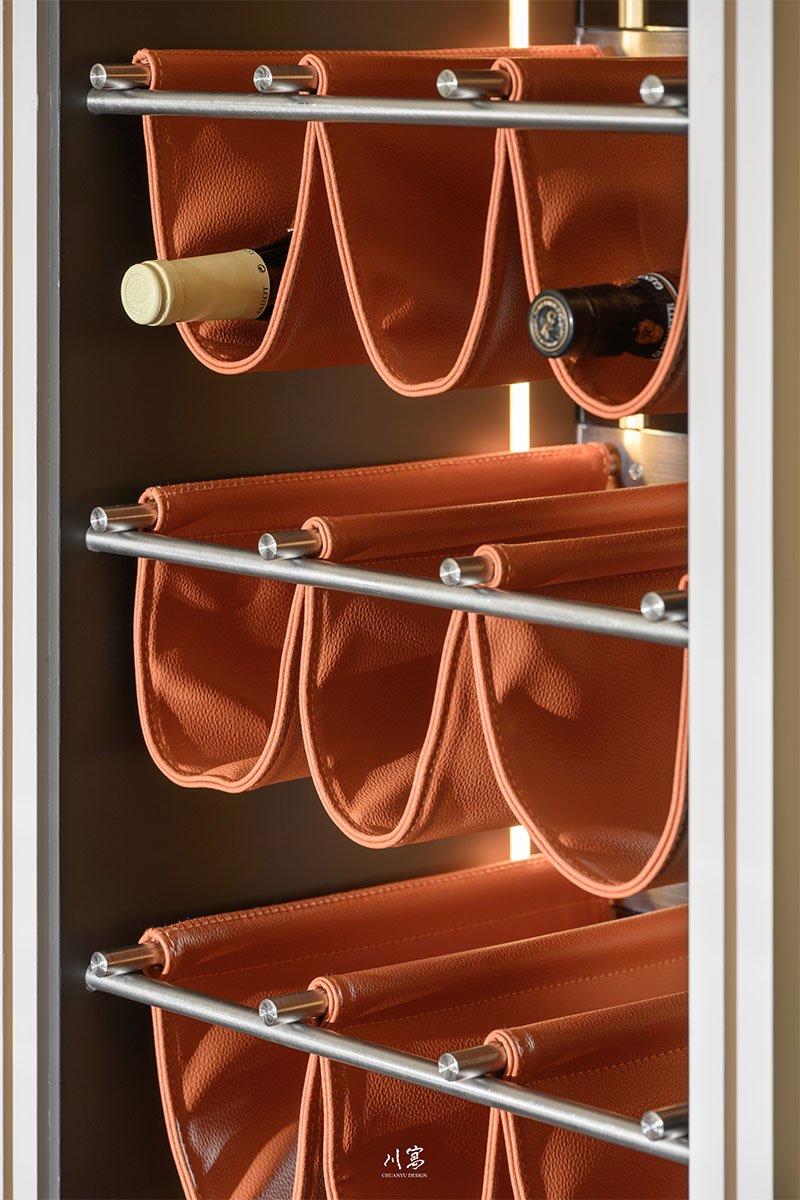 餐桌旁設置整面酒櫃,兼具展示與收藏功能,為空間增添細膩層次。暖橘色皮革搭配淺木色調,營造出慵懶且溫潤的氛圍,讓用餐時光顯得從容愜意。