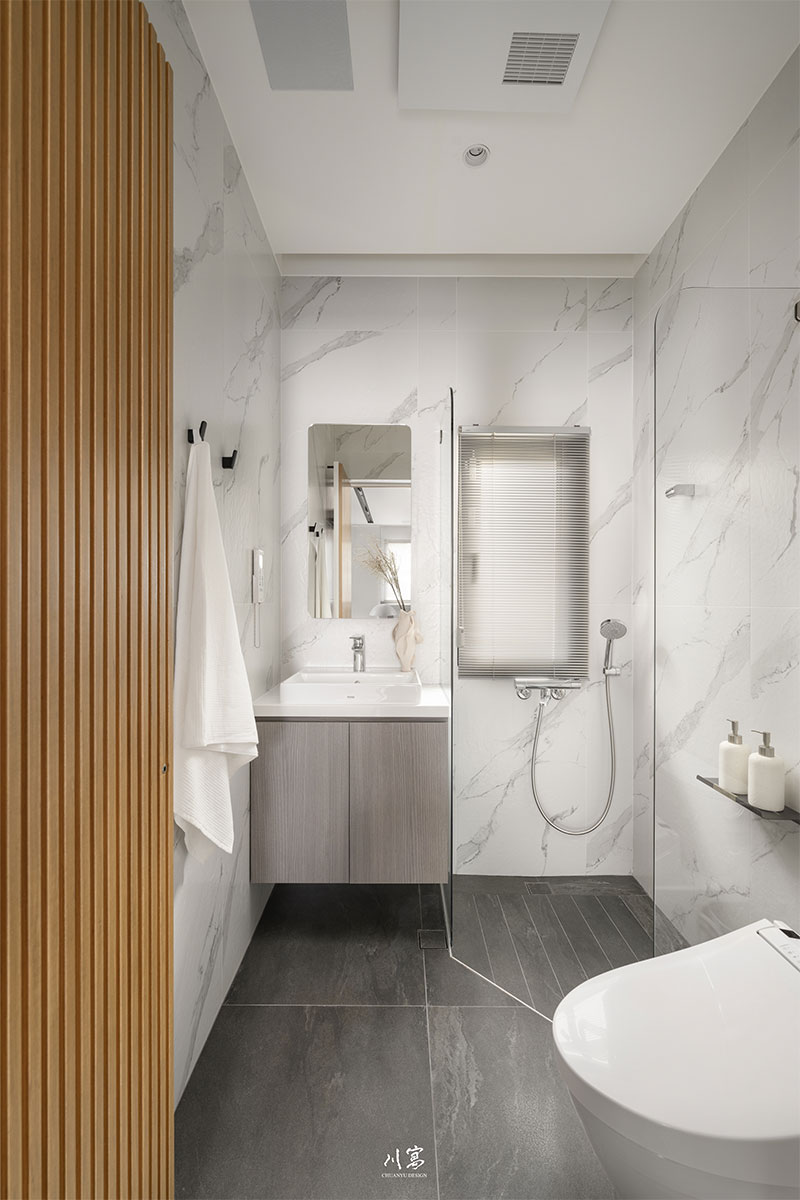 衛浴空間維持簡潔純淨的基底,並在牆面磁磚的選擇上注入變化,採用帶有淺灰紋理的材質,讓整體氛圍在低調中帶點活潑與層次感。