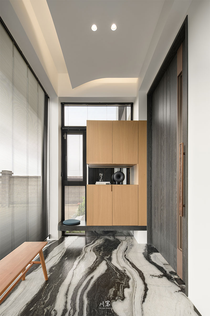 白色與灰色為主色調,宛如一幅乾淨清爽的畫布,點綴了多樣材質的細節,例如溫潤質感的實木門、帶有自然紋理的大理石牆面,彼此交織出層次感與精緻度。