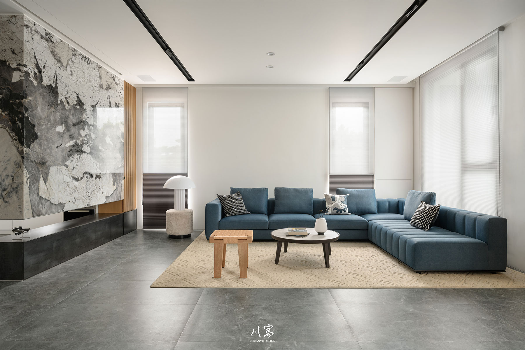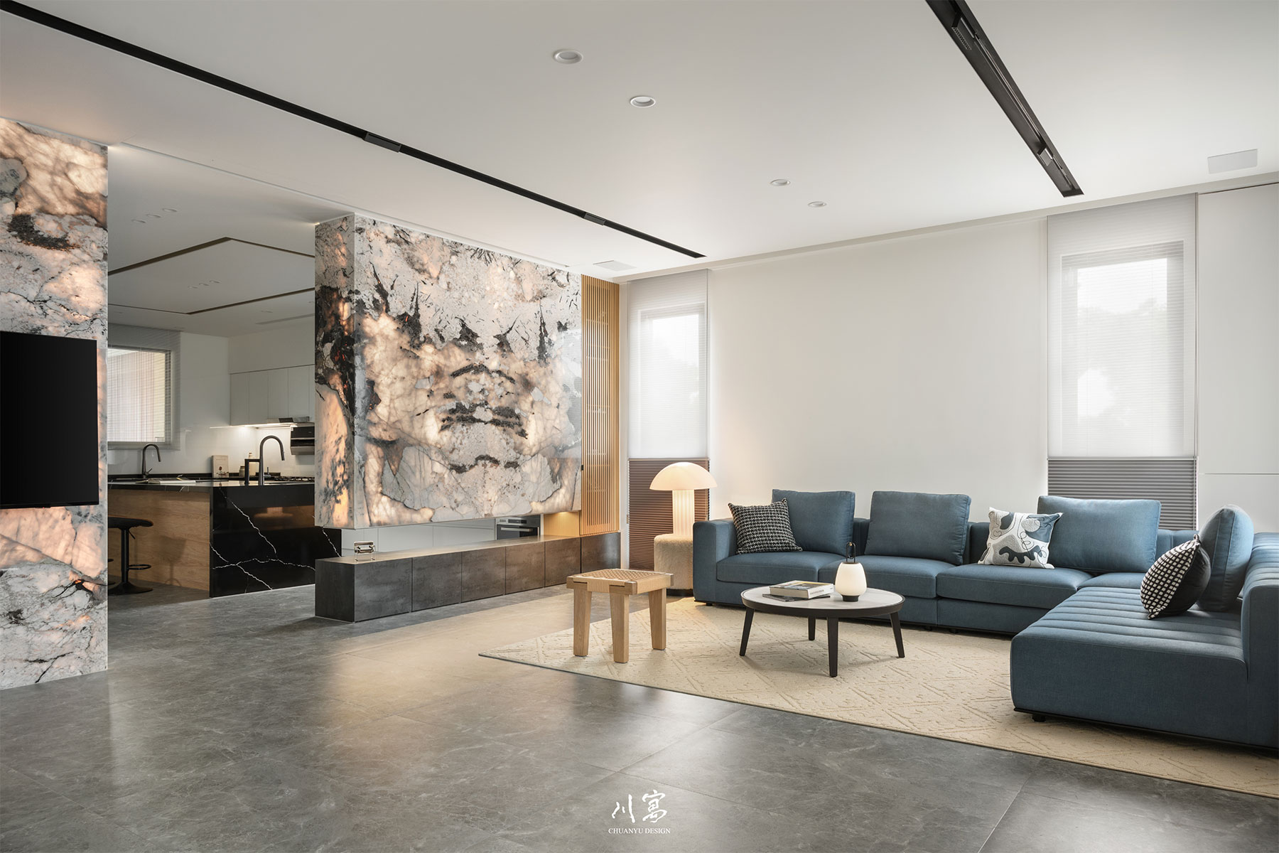 客廳寬敞明亮,大面採光傾瀉而入,映襯著大理石電視牆的華麗紋理。我們在石材中嵌入暖色光源,讓業主能依情境調整光線,營造多變氛圍。