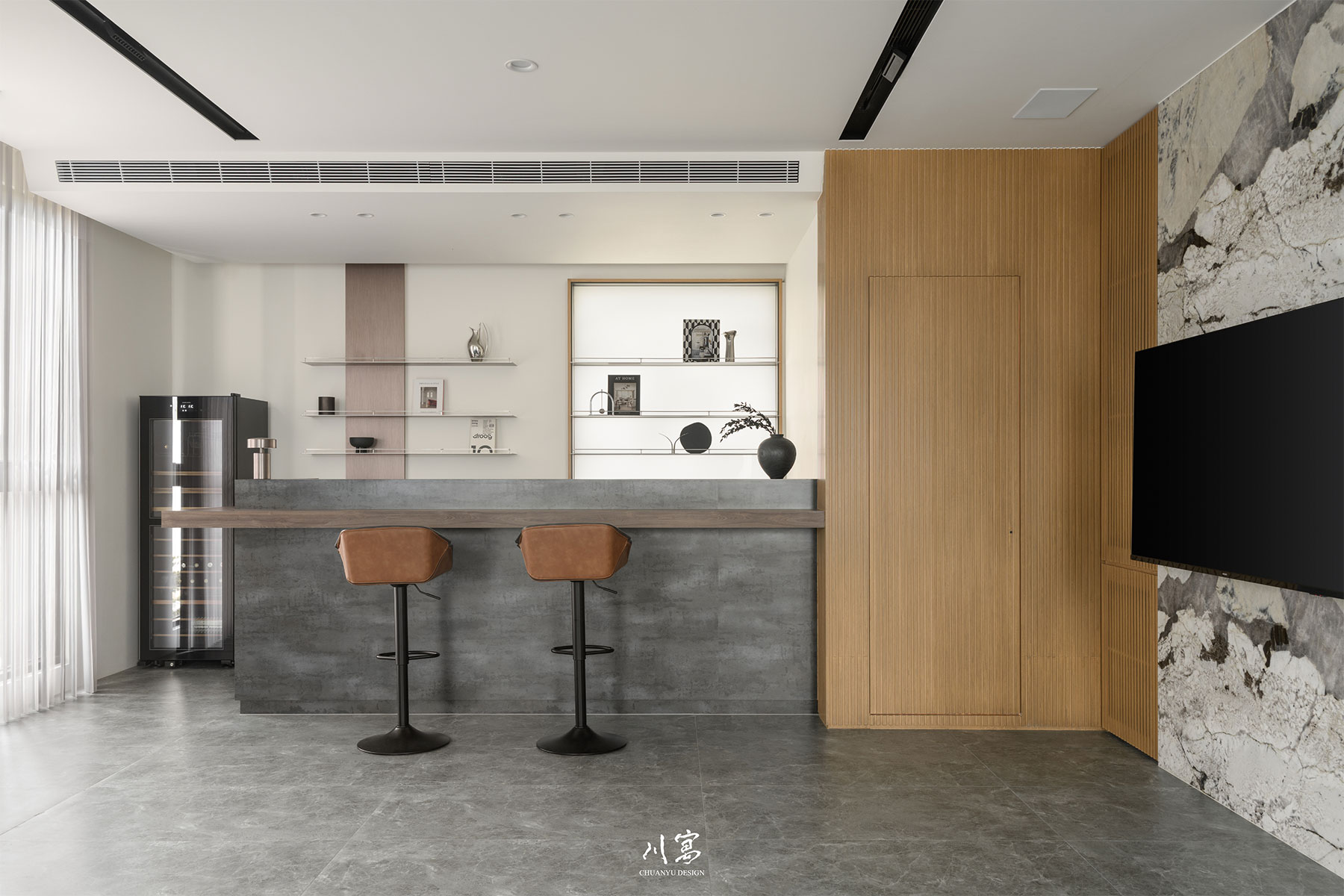 吧台區穿插多樣材質,鋼板的俐落線條延伸出精緻的展示空間。